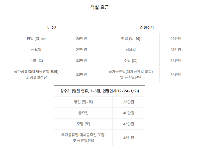 객실 요금은 비수기, 준성수기, 성수기로 나뉘는데요,