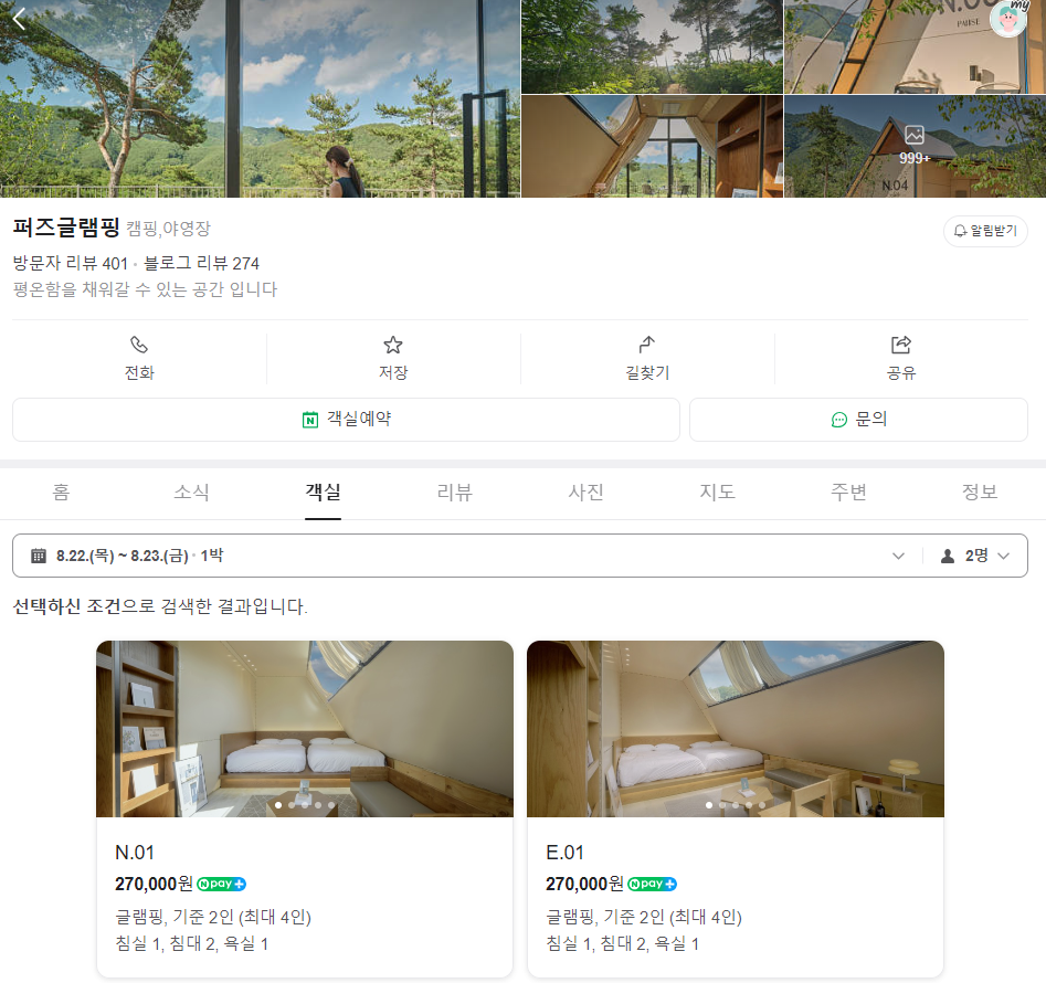 네이버에서 '퍼즈 글램핑' 검색하시고 바로 예약해도 되겠네요!